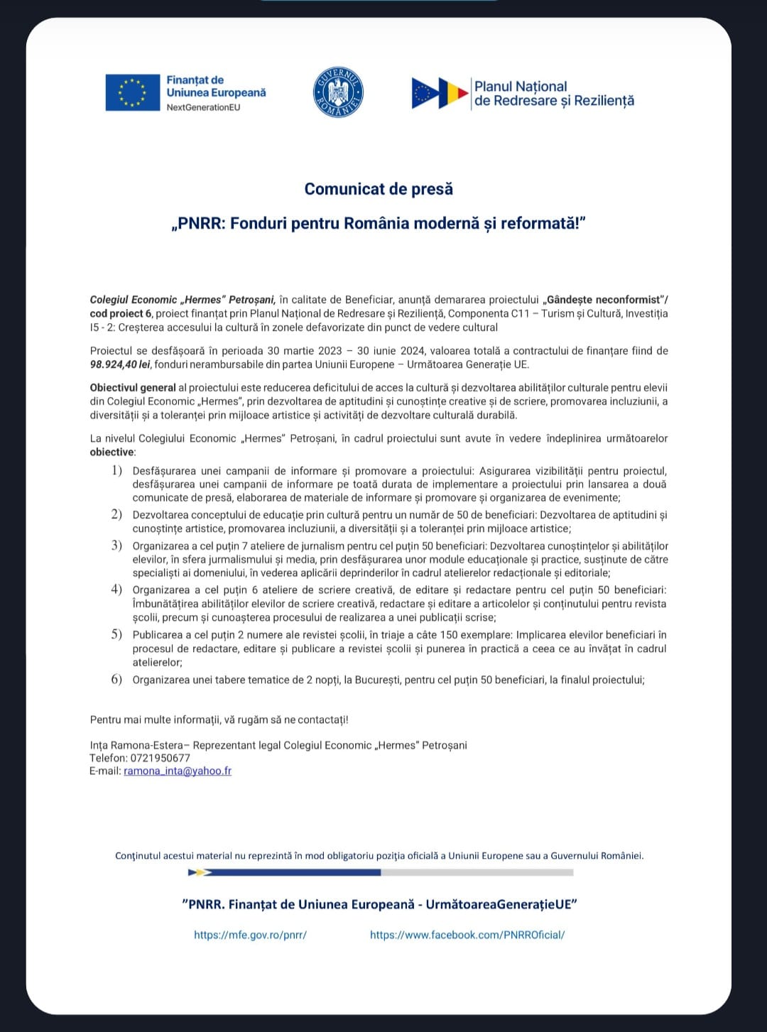 Proiect PNRR Educație prin culturā- “Gândeşte neconformist”