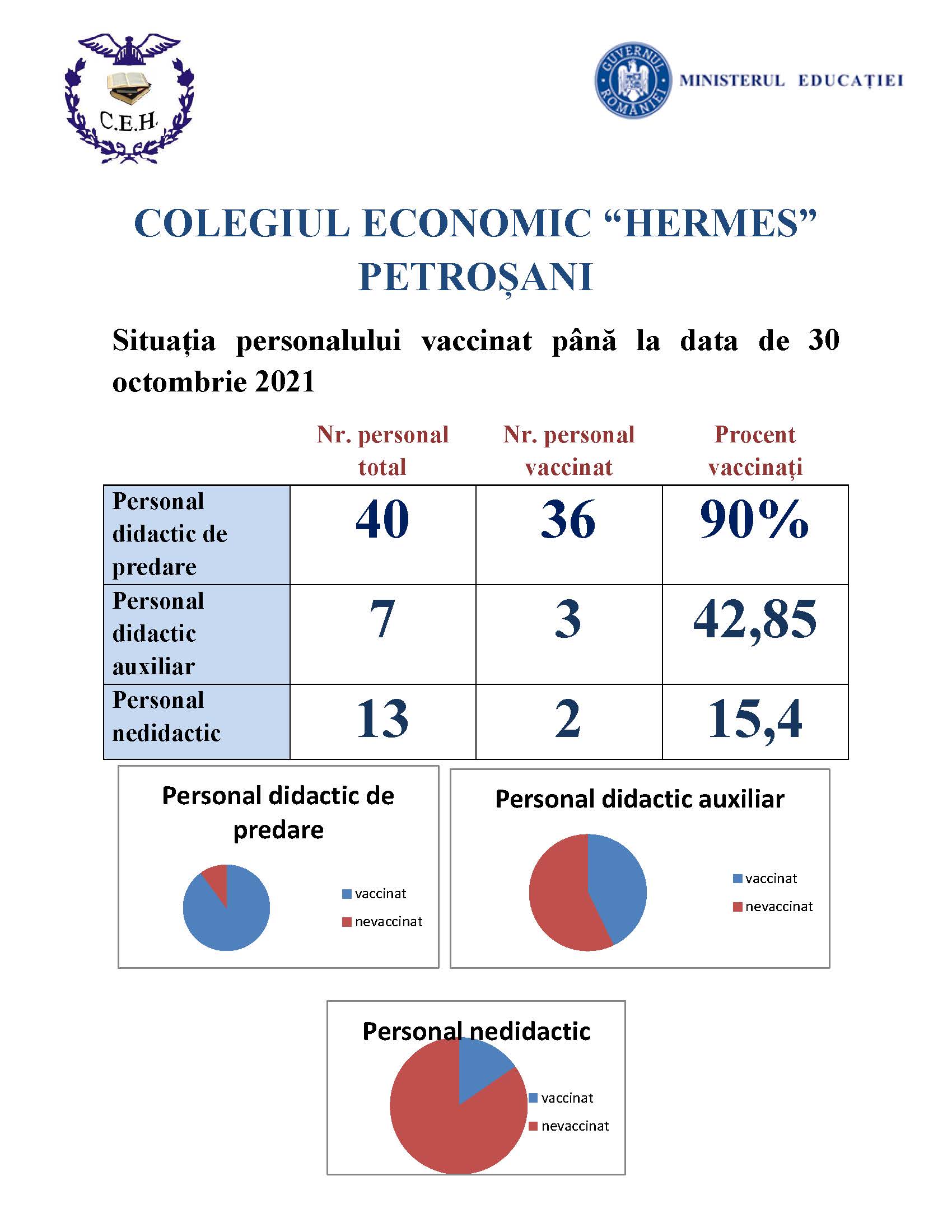 Situația personalului vaccinat până la data de 30 octombrie 2021
