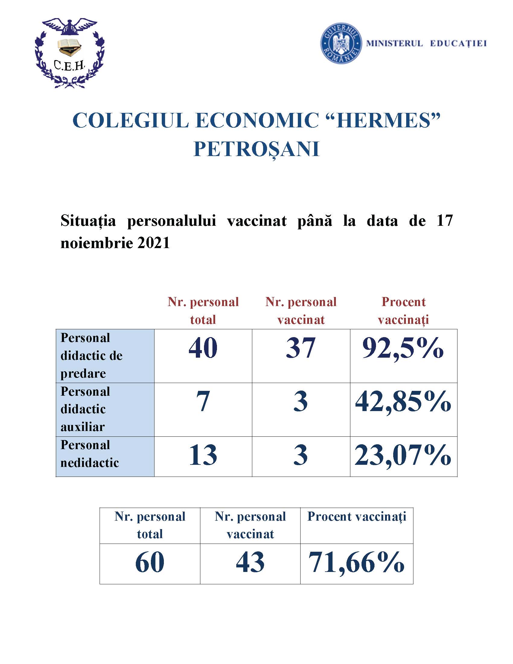 Situația personalului vaccinat până la data de 17 noiembrie 2021