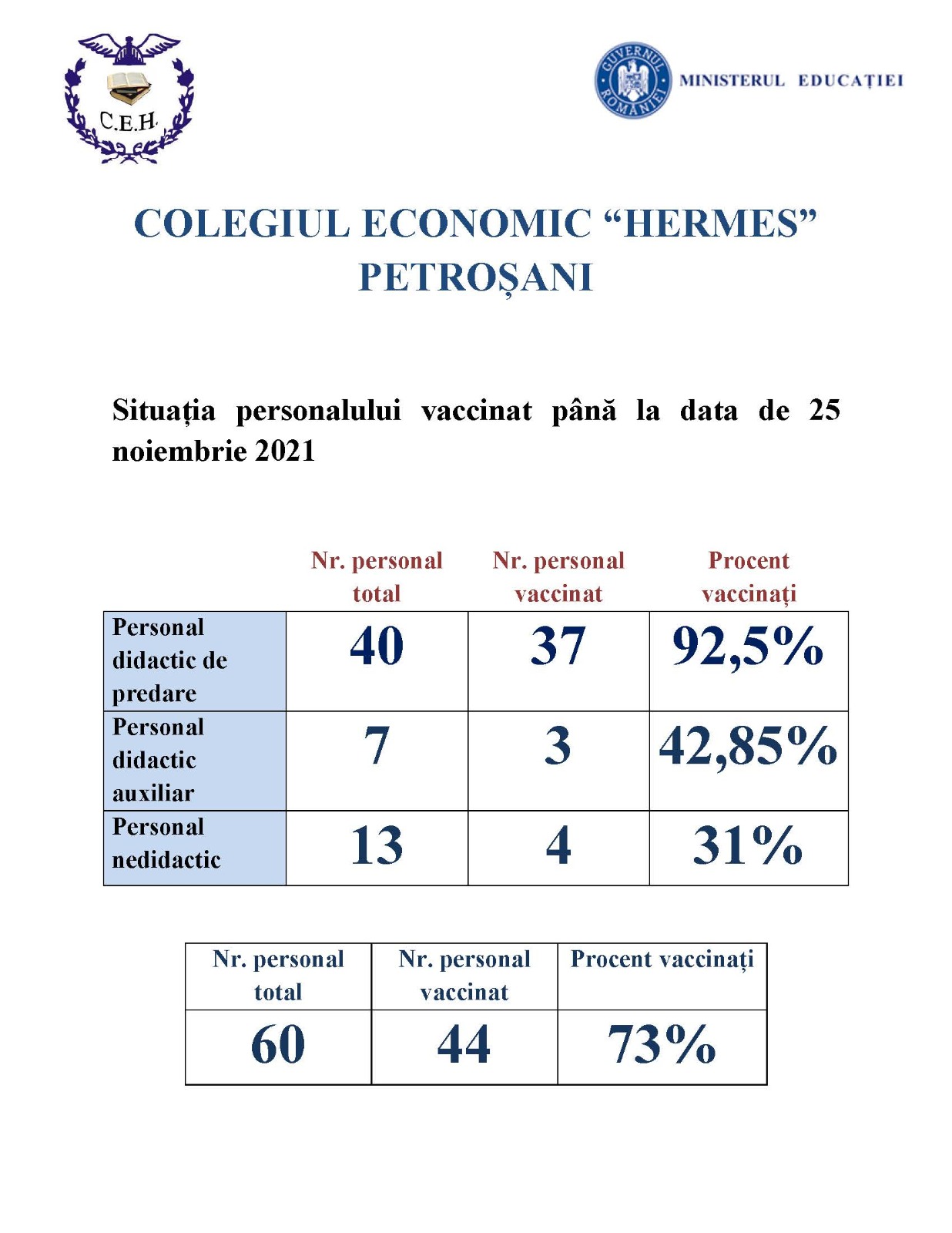 Situația personalului vaccinat până la data de 25 noiembrie 2021