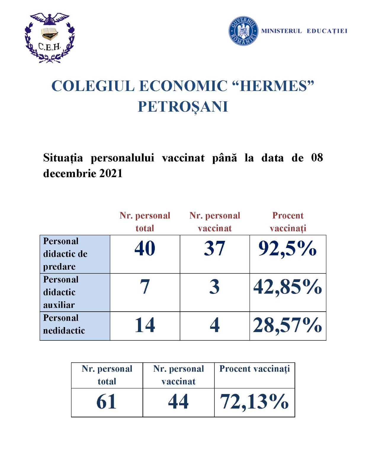 Situația personalului vaccinat până la data de 08 decembrie 2021